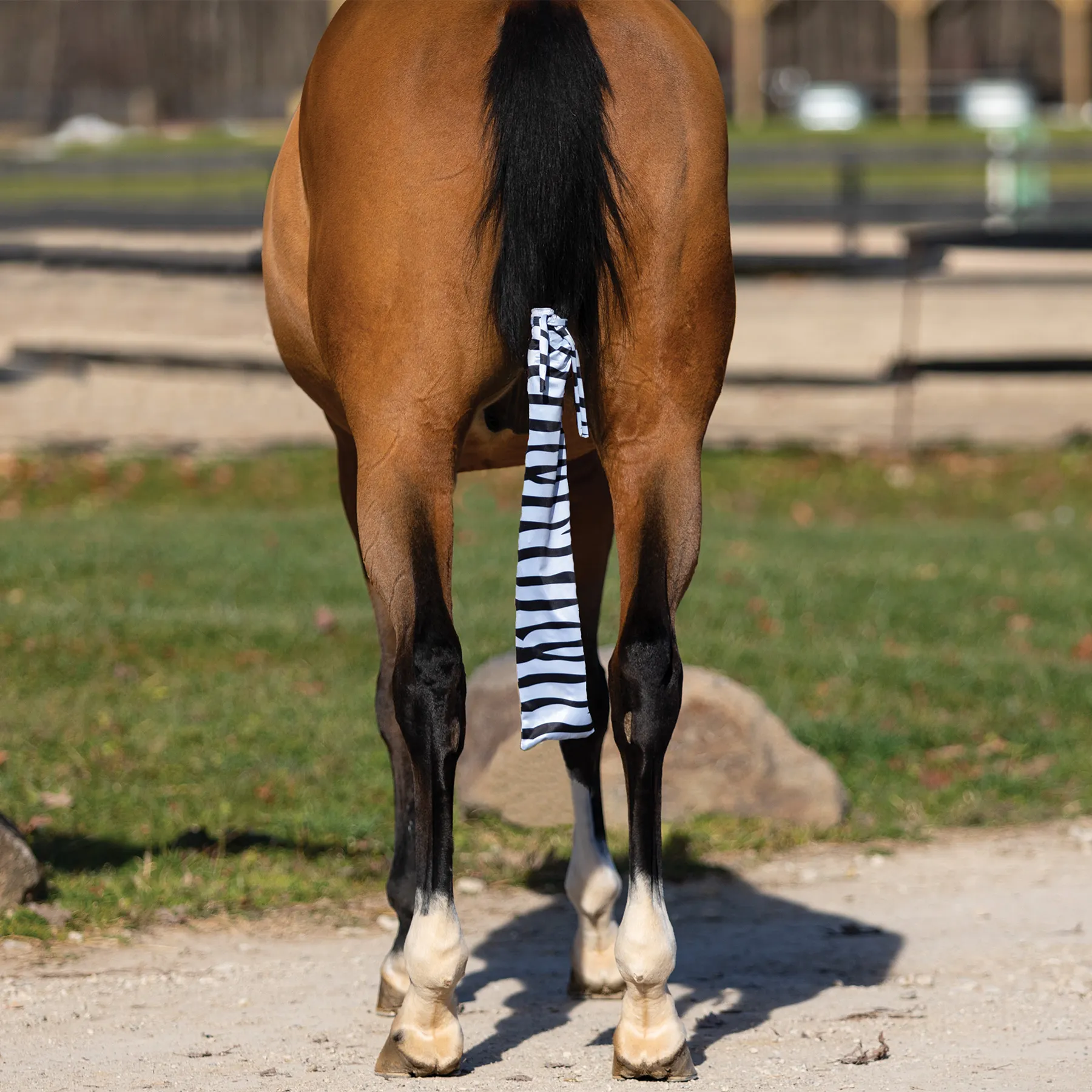 The UltraFlex® Zebra tail bag is the perfect solution for keeping your horse’s tail in beautiful condition while also adding some fun with its zebra pattern design. This tail bag is made from stretchy lycra and provides over 90% UV protection, making it a great choice for sunny days during turnout or on the trail. The self-ties hold the tail bag securely in place, and the smooth, soft and stretchy lycra material ensures that it won’t snag the hair. This zebra tail bag is ideal for braided tails and is great for keeping tails clean during muddy turnouts. It has a 4-way stretch for extra flexibility and comfort for your horse. Protect your horse’s tail in style with the UltraFlex® Zebra tail bag.